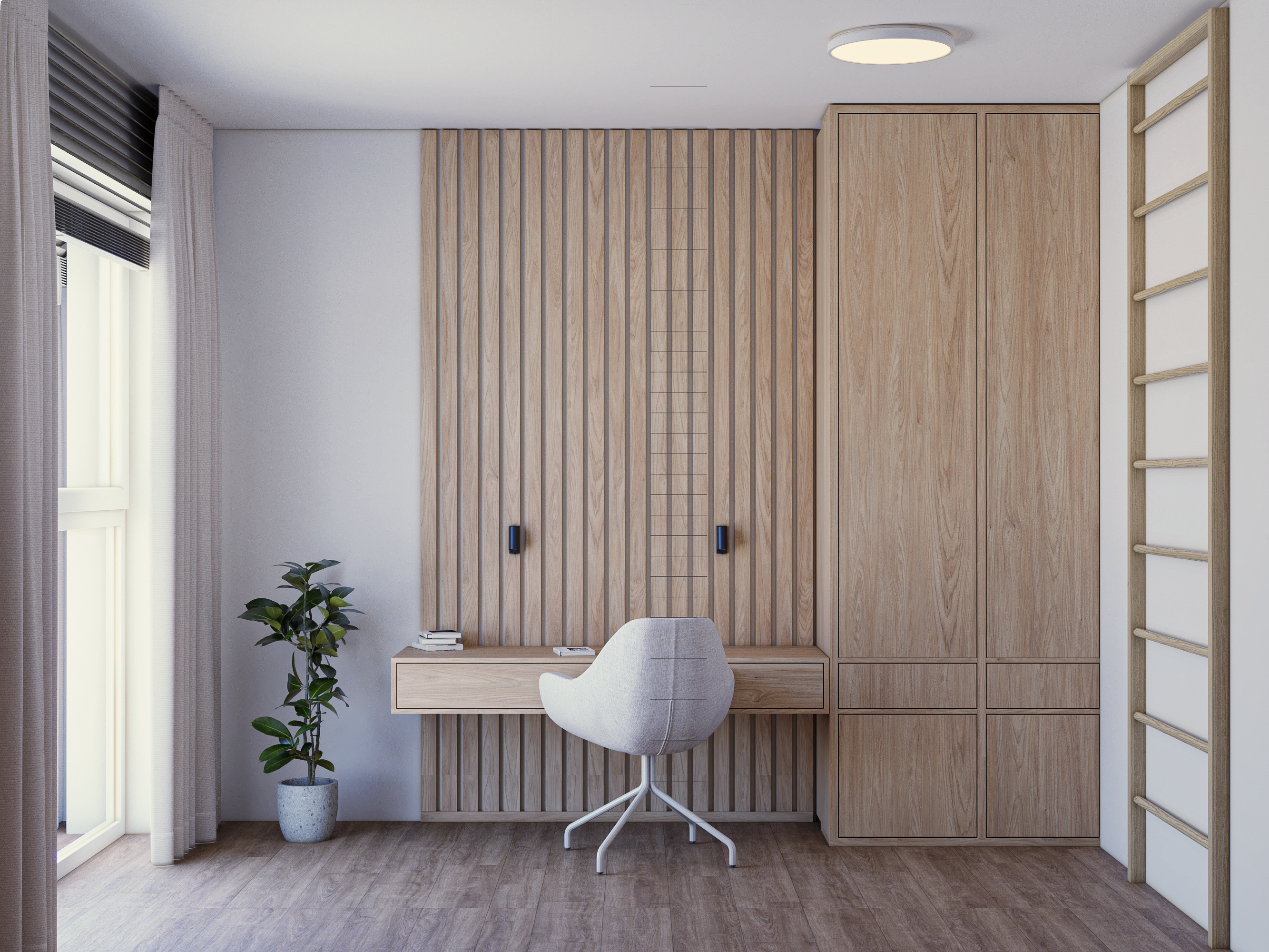 To wnętrze, w którym mniej znaczy spokojniej – przestrzeń do życia i zwolnienia tempa. Postawiliśmy na miękką paletę barw, drewno, prostote i harmonijne formy. Z myślą o codziennym komforcie domowników – tak aby każdy detal wspierał każdego dnia.