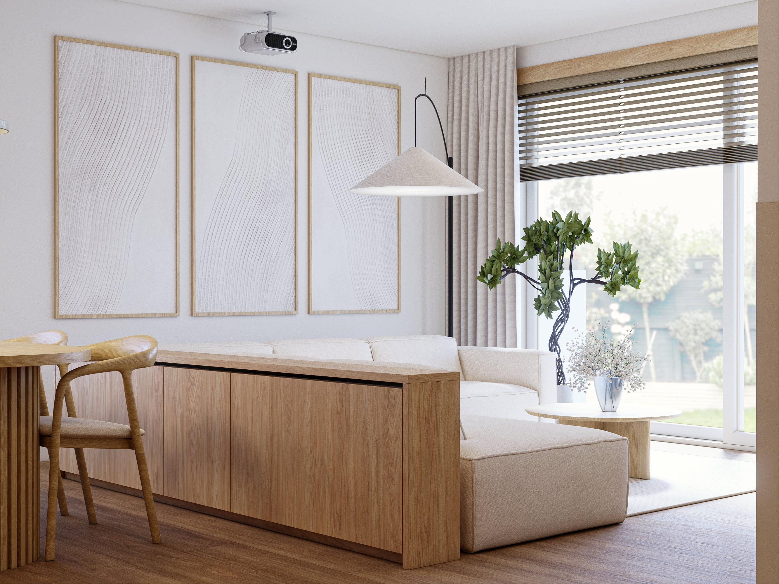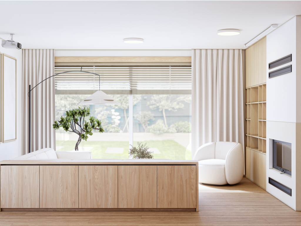 To wnętrze, w którym mniej znaczy spokojniej – przestrzeń do życia i zwolnienia tempa. Postawiliśmy na miękką paletę barw, drewno, prostote i harmonijne formy. Z myślą o codziennym komforcie domowników – tak aby każdy detal wspierał każdego dnia.